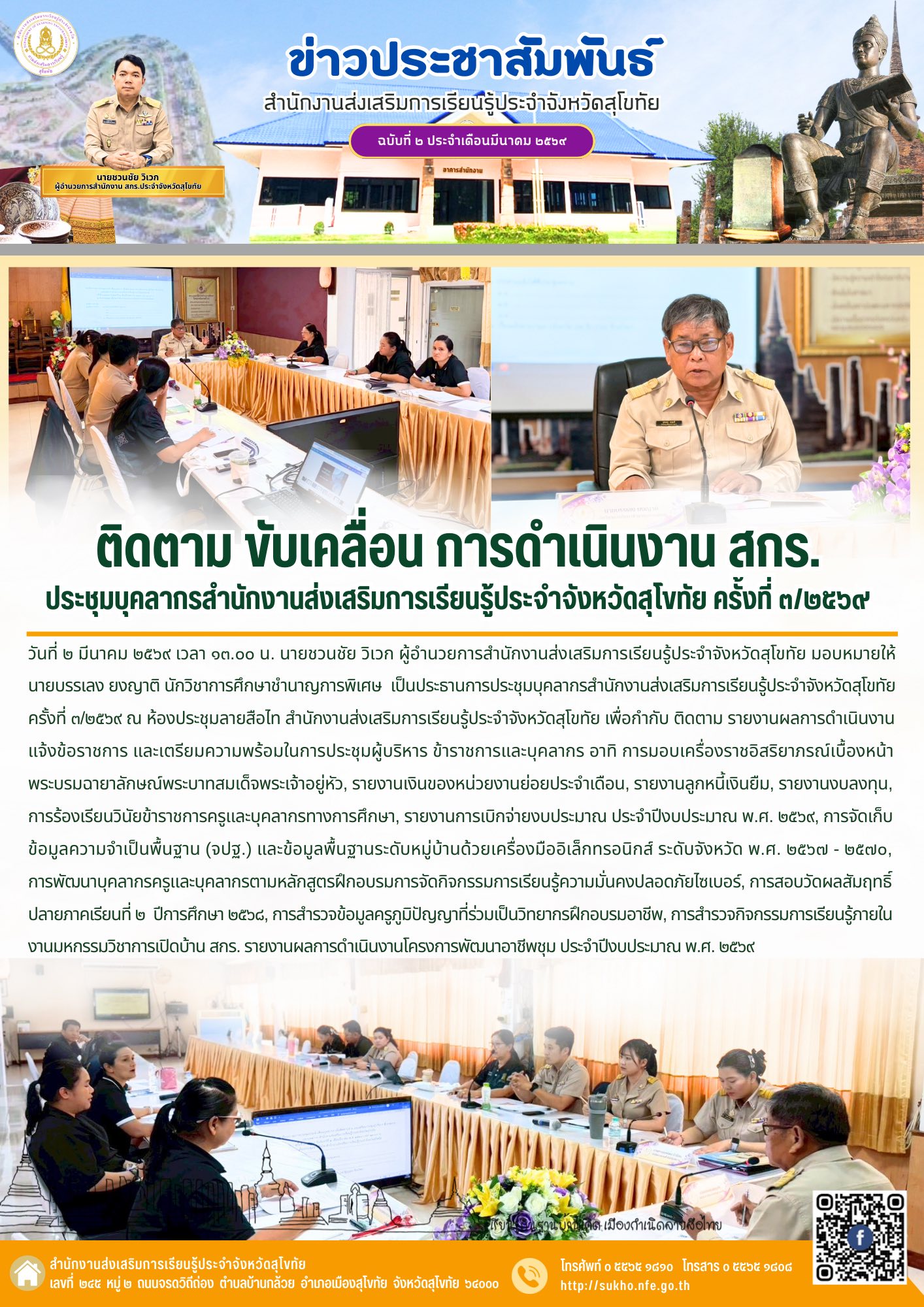 ติดตาม ขับเคลื่อน การดำเนินงาน สกร. ประชุมบุคลากรสำนักงานส่งเสริมการเรียนรู้ประจำจังหวัดสุโขทัย ครั้งที่ ๓/๒๕๖๙